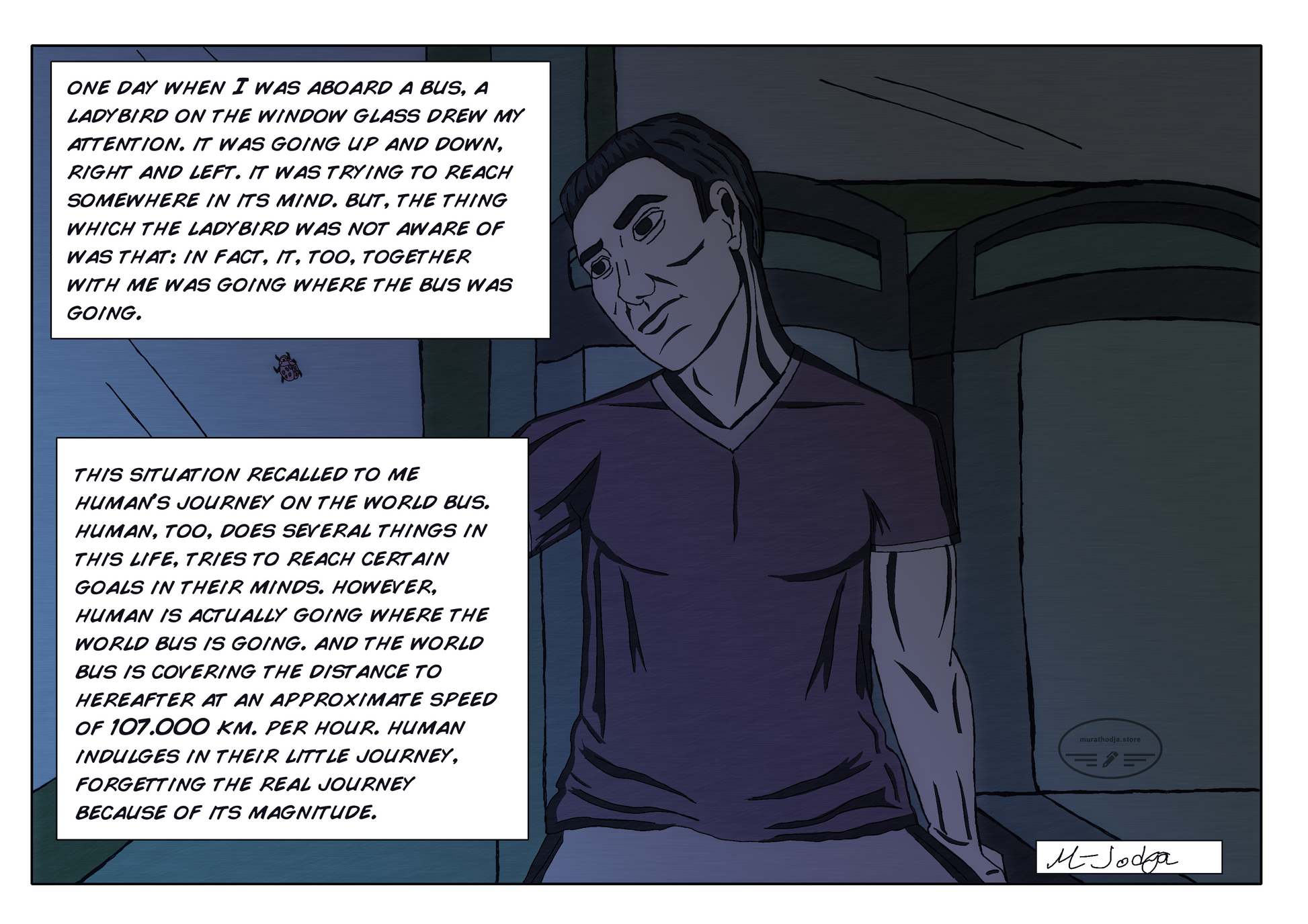 1. It is an illustration with text which narrates a memory of mine about a ladybird on a window glass of the bus, which recalls human's great journey to the hereafter on the world bus.