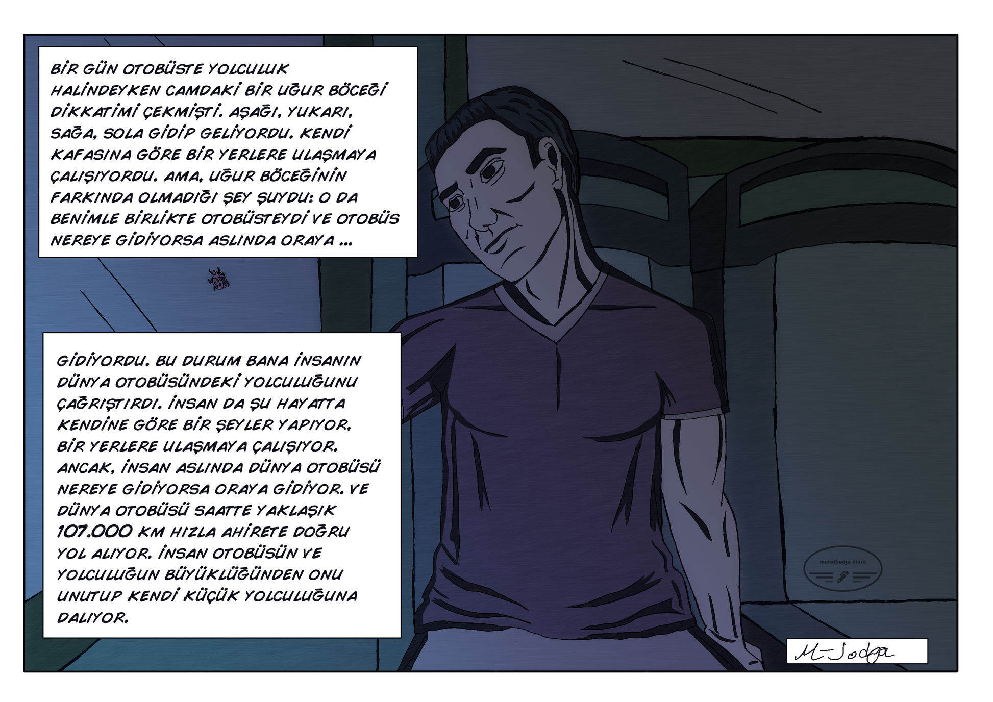 1. Bir otobüs yolculuğu esnasında camdaki bir uğur böceğinin insanın hayat yolculuğu hakkında yaptığı çağrışıma dair nükteli bir çizimdir.
